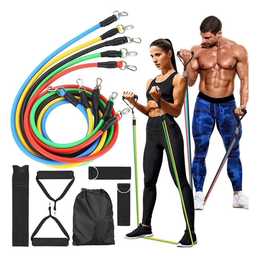 5 guma različite rastegljivosti (jačine), Zuta 2x3kg , Zelena 2x6 kg , crvena 2x8 kg , plava 2x12kg , crna 2x15kg) Ukupnog Opterecenja od 88 KG