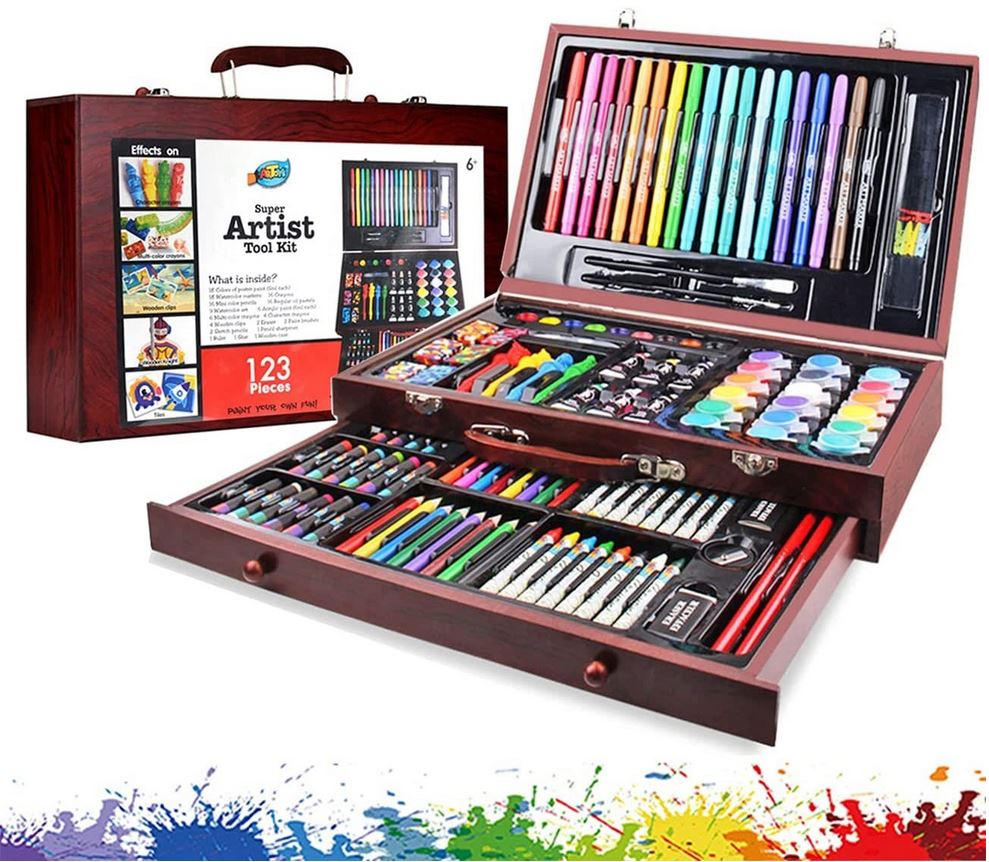 Visenamenski umetnicki set od 123 delova, ukljucujuci umetnicke potrepstine za umetnicko crtanje, slikanje i još kompletni set uključuje suve i vlažne podloge,